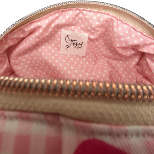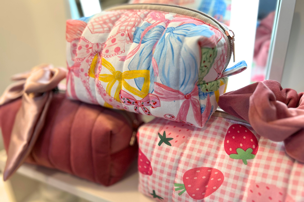 Handmade box makeup bags in gingham, velvet, and bows — pretty meets practical in every stitch.