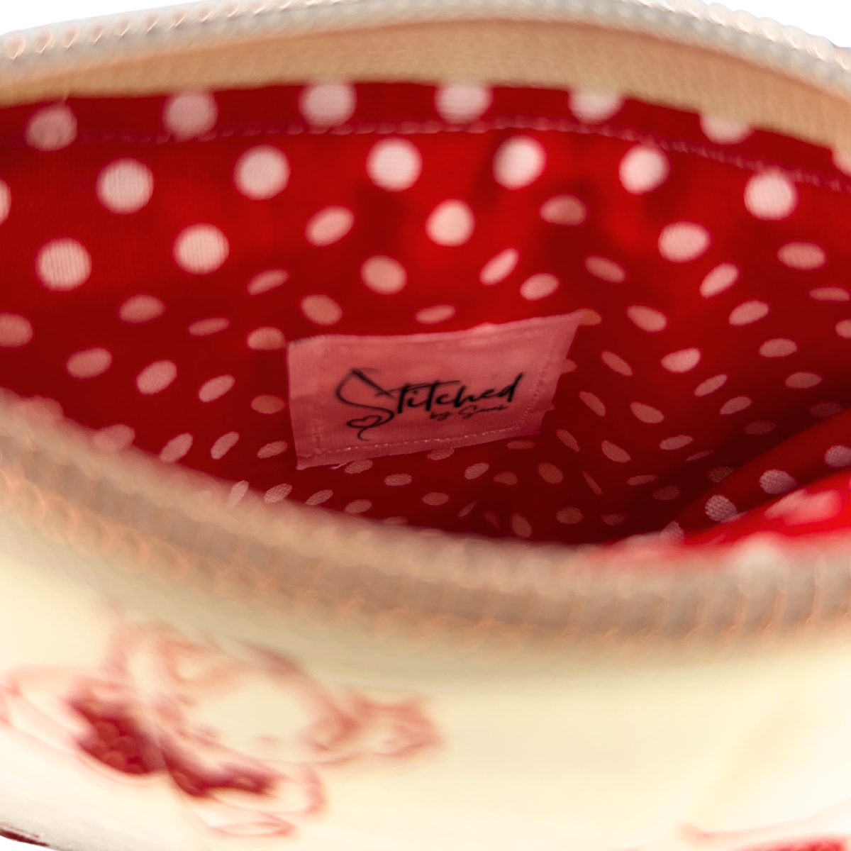 - Rose Gold Zip & Fabric Tab: Featuring a polished rose gold zipper with a red with spots fabric tab (made from the same lining fabric) – charming and coordinated.